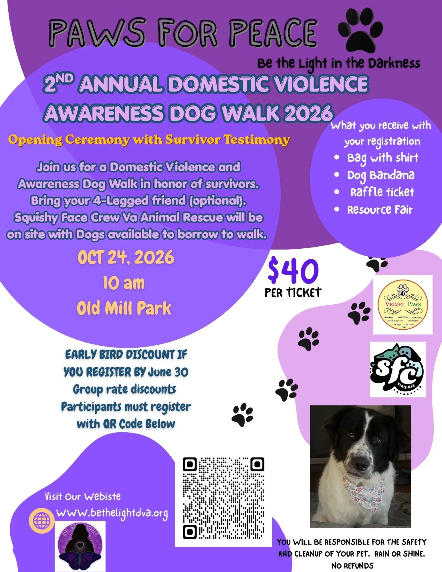 Participants are responsible for the safety and cleanup of their animals throughout the event. Please note that this is a rain-or-shine event, and all registrations are non-refundable. All proceeds directly benefit survivors through Be the Light in the Darkness.